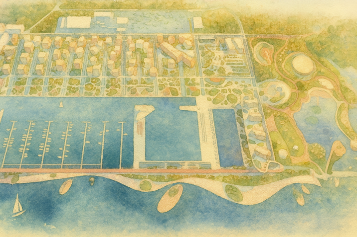 Сердцем проекта станет масштабная яхтенная марина, способная принимать суда длиной до 150 метров. Архитектурный облик кластера поразит смелыми решениями: высотные доминанты до 140 метров, искусственное озеро с маяками и набережная с общественными пространствами. Гостиничный фонд, деловые центры и развлекательные зоны создадут полноценную курортную инфраструктуру мирового уровня.